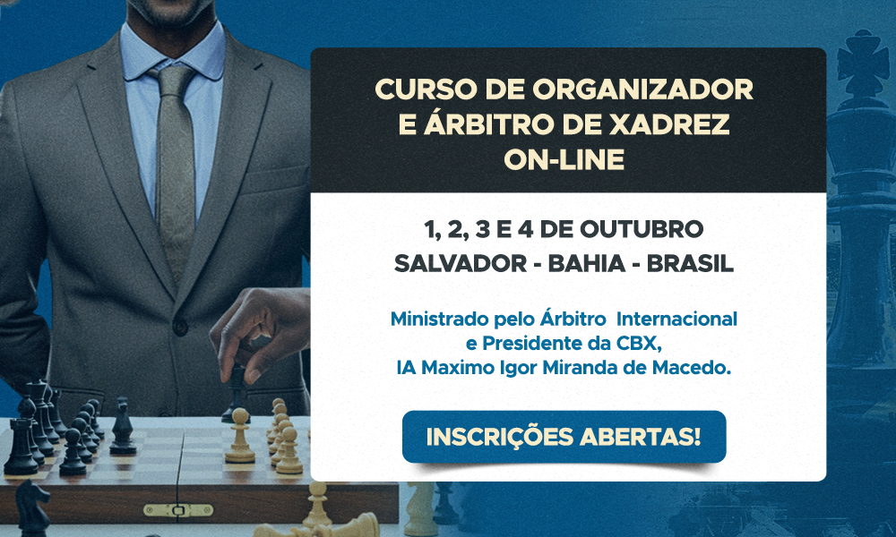 O CURSO DE ORGANIZADOR E ÁRBITRO DE XADREZ 2025 tem como finalidade proporcionar aos participantes do ESTADO DA BAHIA um conhecimento sólido das Leis do Xadrez, conforme estabelecidas pela FIDE, e de sua correta aplicação em situações práticas de torneios.