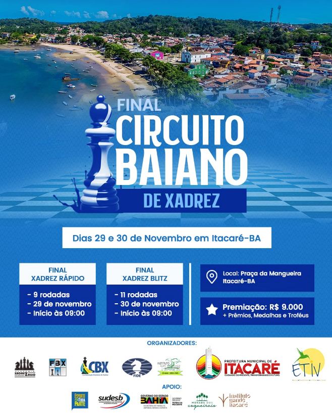 Um dos momentos mais esperados do calendário enxadrístico baiano chegou. Nos dias 29 e 30 de novembro, a bela cidade de Itacaré sediará o Final do Circuito Baiano Pinto Paiva, reunindo os melhores talentos do nosso estado nas emocionantes modalidades Rápido e Blitz. Entre praias exuberantes, cultura vibrante e hospitalidade marcante, o evento promete unir competição e confraternização em um cenário de rara beleza. Cada tabuleiro será palco de grandes batalhas intelectuais, onde a precisão, a estratégia e o espírito esportivo definirão os campeões de 2025. Itacaré, joia do litoral sul da Bahia, se prepara para viver um fim de semana inesquecível, onde o xadrez será celebrado em sua forma mais pura e vibrante.