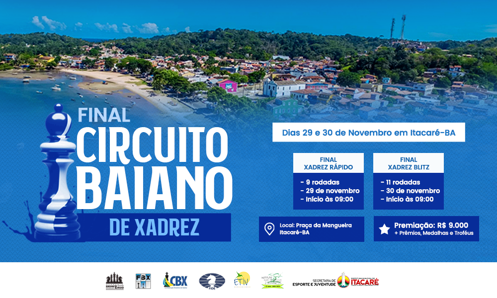 Itacaré – Bahia – Brasil | 29 e 30 de Novembro de 2025 Um dos momentos mais esperados do calendário enxadrístico baiano chegou. Nos dias 29 e 30 de novembro, a bela cidade de Itacaré sediará o Final do Circuito Baiano Pinto Paiva, reunindo os melhores talentos do nosso estado nas emocionantes modalidades Rápido e Blitz. Entre praias exuberantes, cultura vibrante e hospitalidade marcante, o evento promete unir competição e confraternização em um cenário de rara beleza. Cada tabuleiro será palco de grandes batalhas intelectuais, onde a precisão, a estratégia e o espírito esportivo definirão os campeões de 2025. Itacaré, joia do litoral sul da Bahia, se prepara para viver um fim de semana inesquecível, onde o xadrez será celebrado em sua forma mais pura e vibrante. Mais do que uma competição, o Final do Circuito Baiano Pinto Paiva representa a consagração de uma jornada que percorreu várias cidades, entre inúmeros clubes, difundindo conhecimento e despertando talentos. Em Itacaré, cada lance será mais do que um movimento — será a expressão de uma temporada inteira de esforço, disciplina e amor pela arte-ciência-esporte. O evento reunirá mestres, árbitros e jogadores de todas as regiões, reafirmando o crescimento e a força do xadrez baiano. A atmosfera inspiradora da cidade litorânea trará uma energia especial ao torneio, coroando um ano de intensas competições com um espetáculo digno da tradição que o Circuito já representa. A Final em Itacaré será não apenas um encerramento, mas um marco de celebração do talento e da união da comunidade enxadrística da Bahia. Com o som do mar ao fundo e o encanto natural da região, cada partida ganhará um brilho próprio, tornando-se memória viva para os que amam o tabuleiro. A Federação Bahiana de Xadrez convida todos os atletas, clubes e apaixonados pelo xadrez a participarem desse momento histórico, que unirá esporte, cultura e amizade. Prepare-se para um fim de semana inesquecível, repleto de emoção, beleza e excelência técnica. Itacaré o aguarda para o grande capítulo final do Circuito Baiano Pinto Paiva 2025! ♟️ LEIA O REGULAMENTO DA COMPETIÇÃO FORMULÁRIO DE INSCRIÇÃO Gens Una Sumus! Federação Bahiana de Xadrez